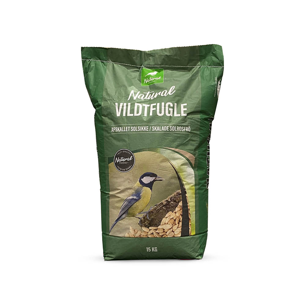 Afskallede solsikke til havens vilde fugle og andre dyr – fx egernet. Solsikke er meget næringsrige og fulde af smag, fra det høje indhold af olie. Skallen er pillet af solsikken, så fuglen ikke efterlader svineri når den spiser. Afskallede solsikke kan anvendes hele året rundt og hvis der fodres regelmæssigt, vil det holde fuglene ved foderpladsen.