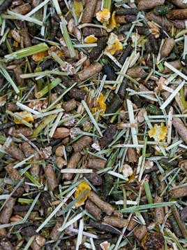 Composition Havreskaller (fiberdel uden kerne), lucerne, bygflager, sojaskaller, havre, lucernestrå, melasse, roepiller, majsflager, rapsfrømel, græsgrønmel, spelt, ekstruderet hørfrø, hørfrø, ærter, hørfrøkage, sojaolie, kartoffelstivelse, cikorie, hørfrøolie.