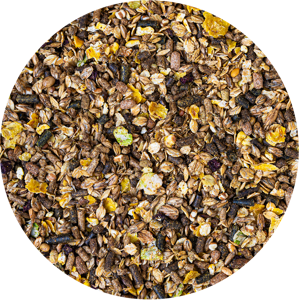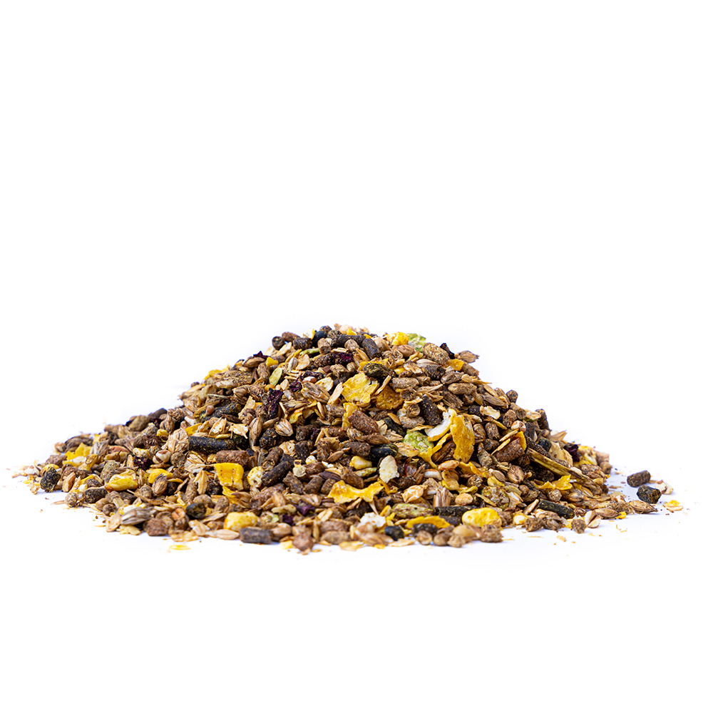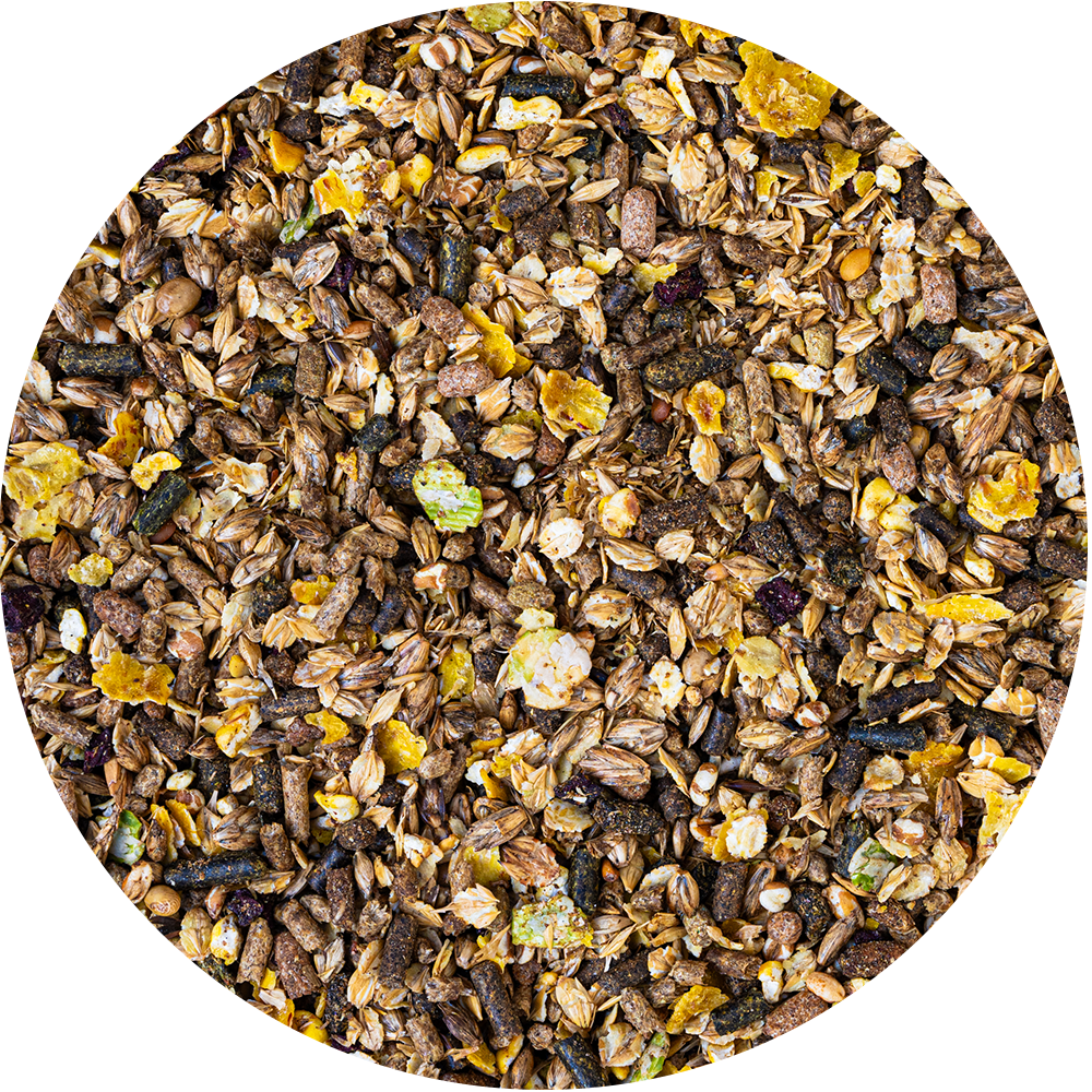 [0] => Havreskaller, Byg Lucerne, Hvedeklid, rapskager, sojabønner (NON-GMO), majsmask, majs, ærter, ekstruderet hørfrø, puffet byg, Rapsolie, hestebønneskaller, roesnitter, rødbedeflager, Dumosweet, cikorie,