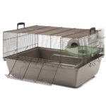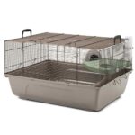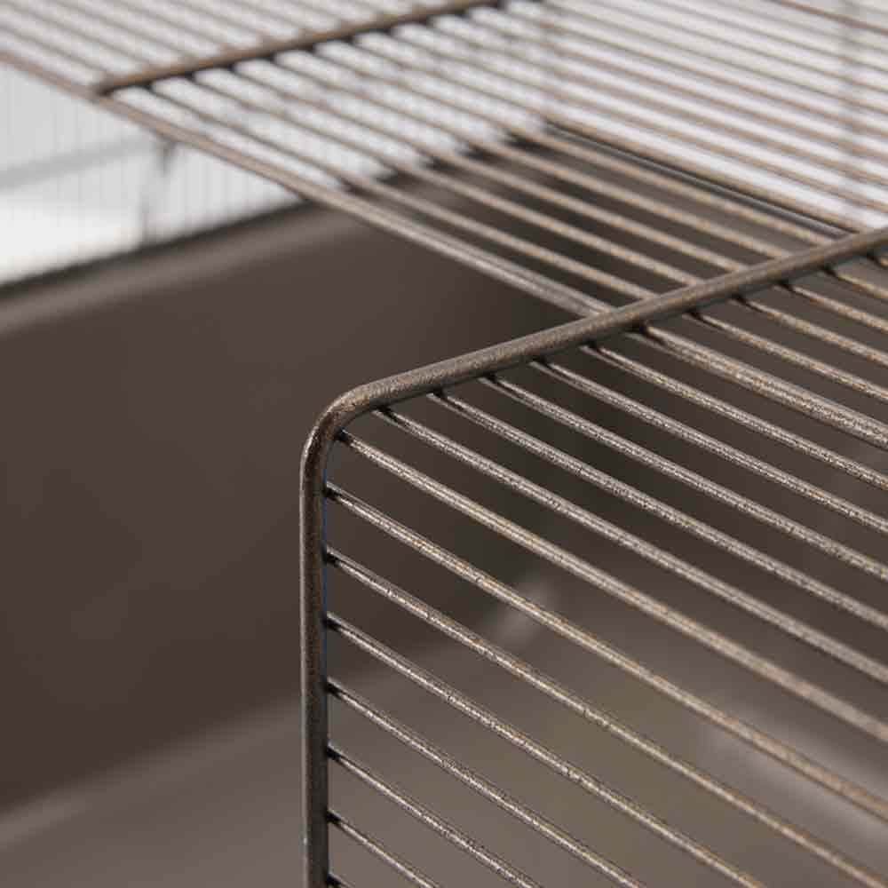 Stabilt mus og dværghamster hjem; med ekstra stor frontklap; plastbakke; brunlakeret metalnet; speciel trådbehandling; inkl. tilbehør; trådafstand 6,5 mm; størrelse 67 x 49 x 36,5 cm