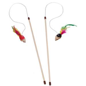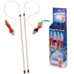 Display 18 stk.; fiskestang med mus; mus med raslelyd og fjer; stang: 45 cm; bånd med legetøj: 53 cm