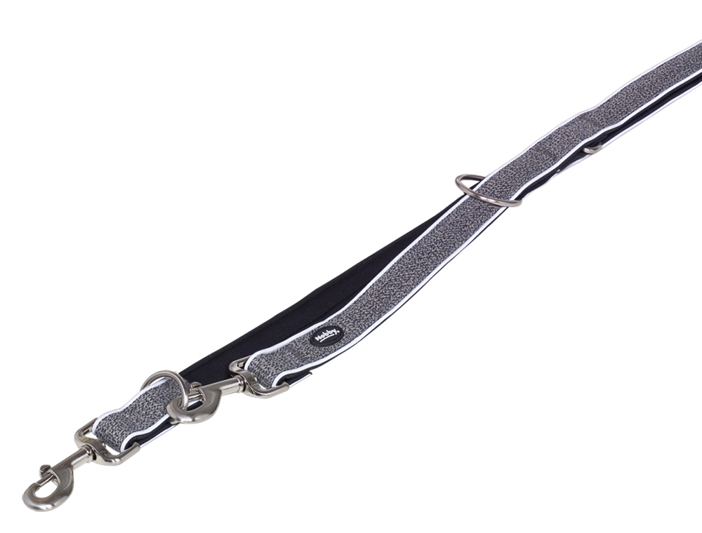 [0] => Nylon-neopren med reflekterende striber; metaldele i mat sølv; blød neoprenforing; lukning øverst lavet af metal; længde: 200 cm, justerbar i tre positioner