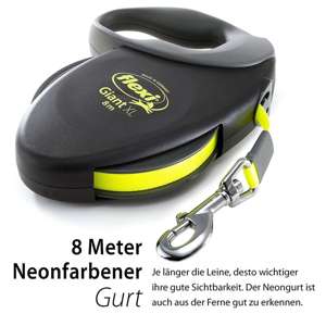 8 m tape; til store hunde op til 25 kg; forkrommet hook; stabilt blødt greb; solid tape; vægt: 437 g