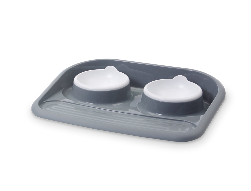 Foderstation “Butler” til katte og små hunde. Indeholder to plastikskåle på 300 ml hver til tørfoder, vådfoder og vand. Hævede kanter forhindrer spild af mad, og den er skridsikker og kan vaskes i opvaskemaskinen.