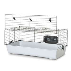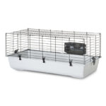 Bur til dværgkanin med plastbakke og udstyr inkluderet. Stor frontdør og trådafstand på 26 mm.