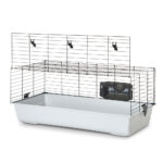 [description] => Bur til dværgkanin med plastbakke og udstyr inkluderet. Stor frontdør og trådafstand på 26 mm.