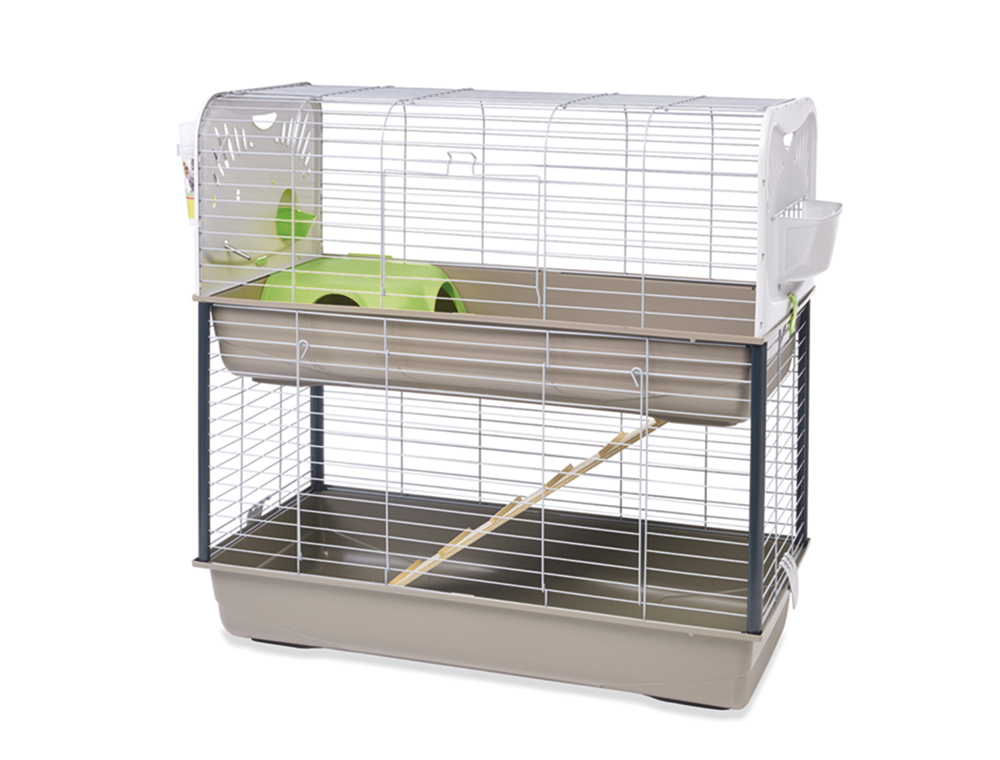 2-etagers lille dyrebur; øverste etage med 2 store døre; nederste etage med 1 stor fordør; inkl. udstyr