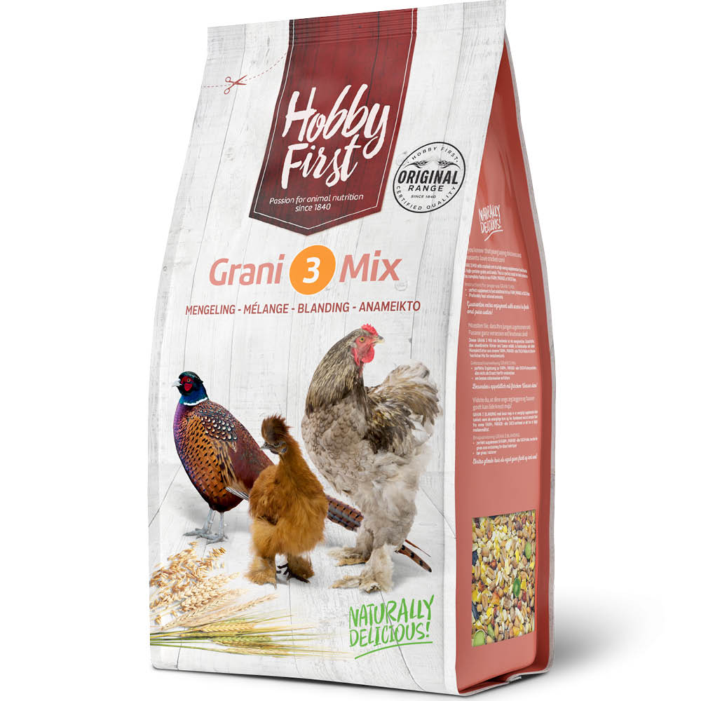 HOBBY FIRST Grani 3 Mix er en lækker kvalitets kornblanding, der fungerer som et tilskudsfoder til voksne æglæggende høns, ænder, duer eller andet fjerkræ.