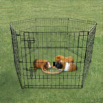 Hvalpegård med 6 elementer på 60x60cm med en dør. Nem at samle og kan bruges både indendørs og udendørs.