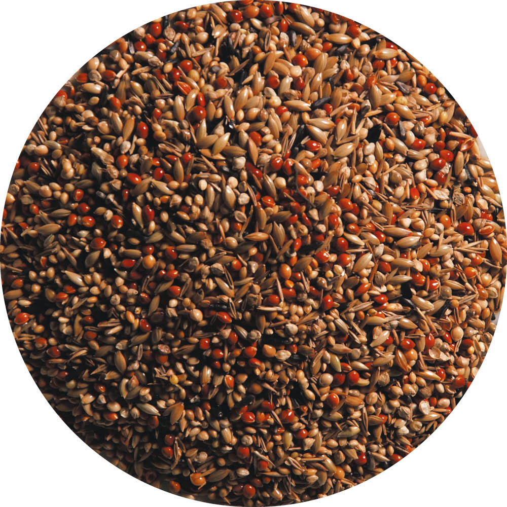 Composition Senegal hirse, rød hirse, kanariefrø, japansk hirse, græsfrø, nigerfrø, sølv hirse, rød mohair.