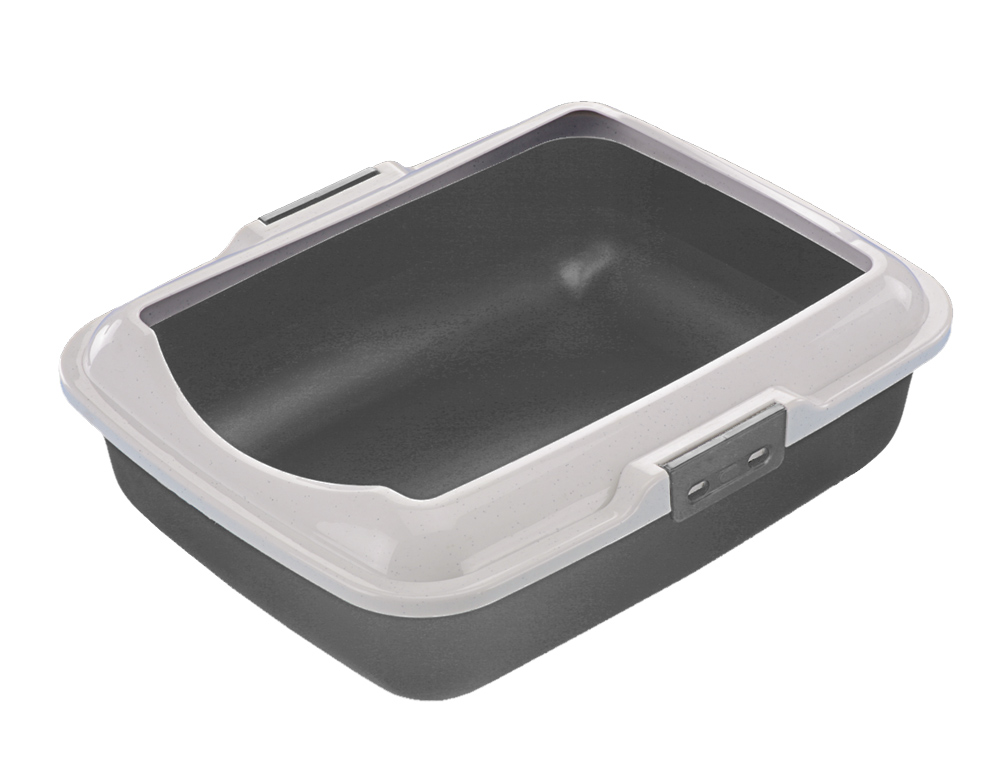 Grå kattebakke med kant i størrelsen 50x40x16cm, som giver din kat en naturlig følelse af sikkerhed og tryghed under brug.
