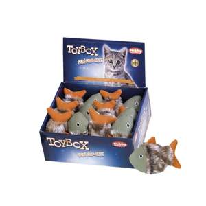 Display med 12 stk kattelegetøj i form af fisk med Matatabi, en stærk katteurt, der giver en spændende legeoplevelse for din kat. Legetøjet er 13 cm langt.