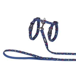 Katte sele og line sæt i robust nylon, justerbart og med både sele og line inkluderet. Findes i forskellige farver og mønstre.