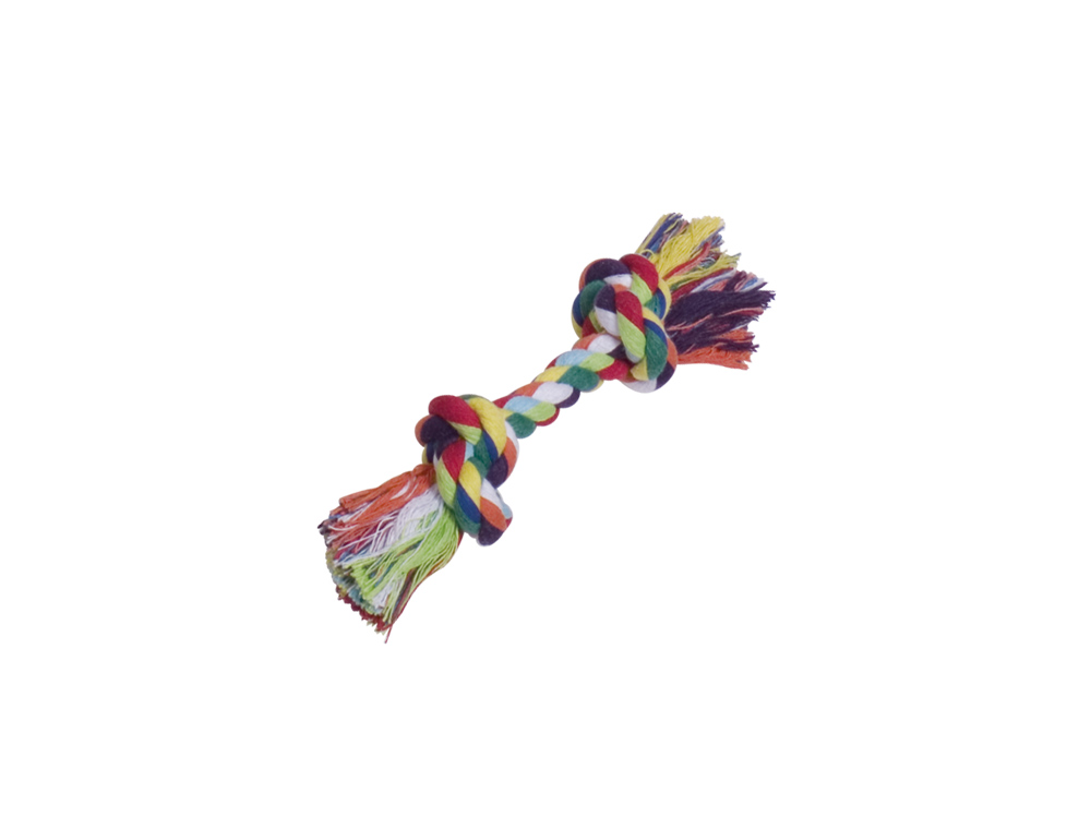 Hundelegetøj i form af en knudret reb med to knuder og en vægt på 50g. Bidrager til tandpleje og er lavet af bomuld.