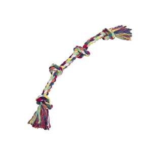 Hundelegetøj i form af en knudret reb med fire knobber, vejer 260g og er lavet af bomuld. Bidrager til tandpleje og er egnet til træk- og hentelege.