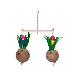 Aktivt legetøj til papegøjer og store parakitter. Består af to kokosnødder med en træstang og er lavet af naturlige materialer som kokosfiber, majsløv, piltræ og sisal. Kan let hænges op i buret med snapkrogen. Måler 50 x 40 cm.