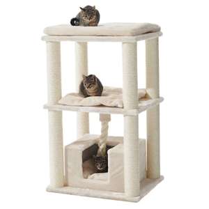Kradsetræ “BRIDA” med en base på 60 x 48 cm og en højde på ca. 90 cm. Udstyret med sisalstammer på Ø 9 cm, en hule på gulvet, et reb hængende over det og 2 åbne liggepladser. Beskyt dine møbler og giv din kat en god alternativ mulighed for at pleje dens kløer.