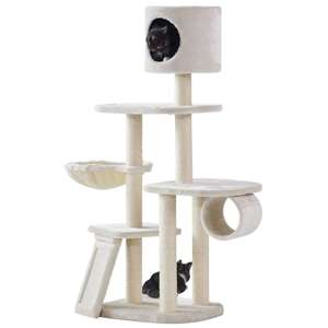 [0] => Kradsetræet "Dilan" i farven creme er 137 cm højt og har en base på 50 x 40 cm. Det er udstyret med Ø 7 cm sisalstammer, en hule, en sisalplade og flere liggepladser.