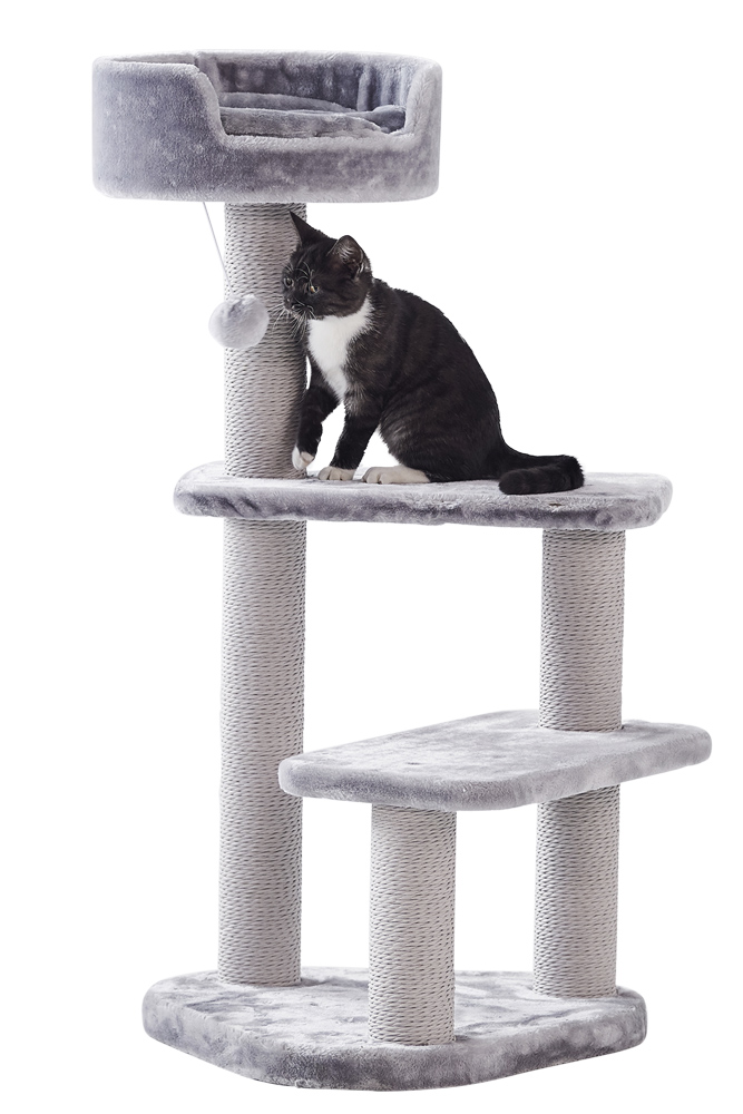 Kradsetræ “Zera” i grå farve med en base på 50 x 50 cm og en højde på 97 cm. Udstyret med Ø 9 cm sisalstammer, en pude og flere liggepladser.