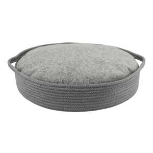 [0] => Grå, hæklet kurv (40% bomuld/60% mikrofiber) med blød plys pude; fyld: vadd; aftageligt betræk (lynlås); 30°C kun håndvask.