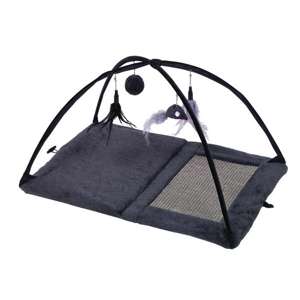 Foldbar kattelegetøjsark med elastiske clips, 4 forskellige legetøjsmuligheder, kradseområde med sisal og catnip til at tilskynde katten til at lege. Måler 60 x 40 x 33 cm.