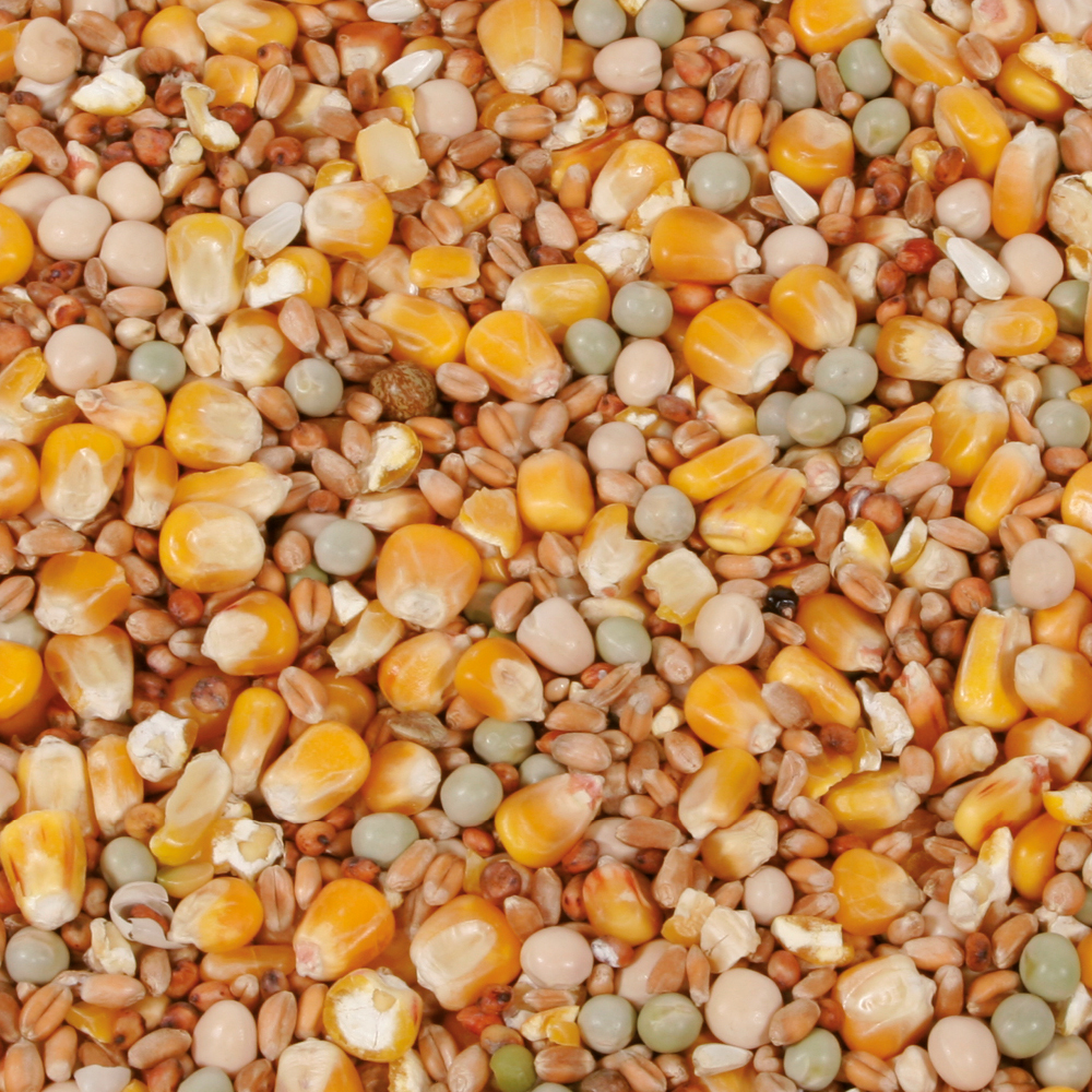 Popcorn Majs 15%, Gule & Grønneærter 27%, Hvede 22%,Fransk Milo 22%, Dari 8%, Kardi 3%,