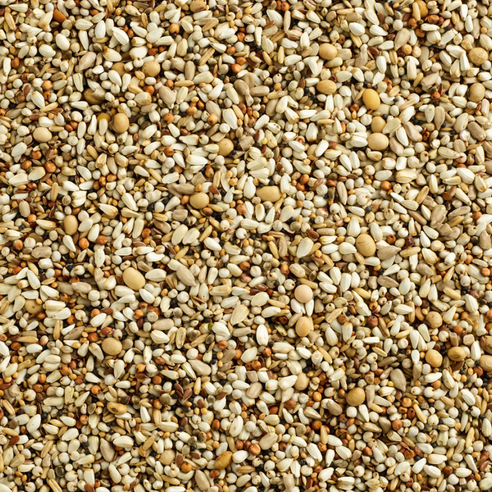 Composition Saflorfrø 32,5%, Dari 17%, Milofrø 8%, afskallet solsikke 7,5%, Ristede sojabønner, afskallet havre 5%, Hamp 5% Gul Hirse 5%, sorte rapsfrø 4%, Hørfrø, Kanariefrø.