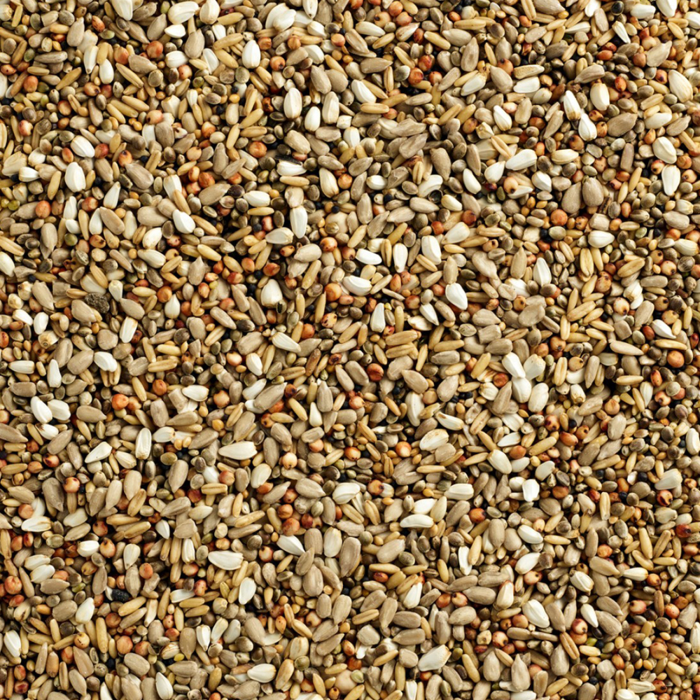 Composition Hampefrø 20% Afskallede solsikkefrø 20% Afskallede havre 20% Milo 15% Saflorfrø 15% Hirse 5% Sorte rapsfrø 5%