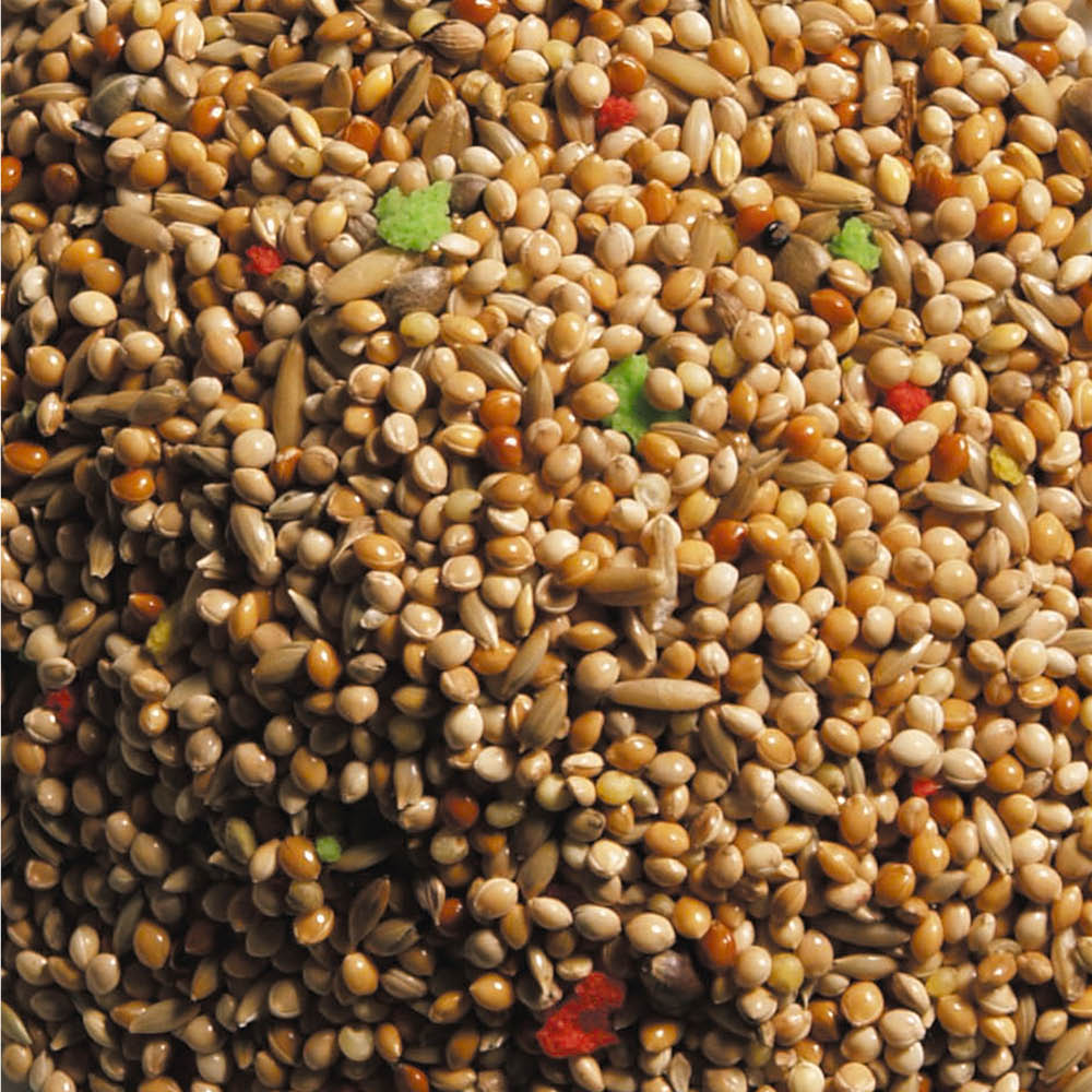 | Composition | Gul hirse, hvid hirse, kanariefrø, afskallet havre, rød hirse, hamp, tilsat æggesnack |
