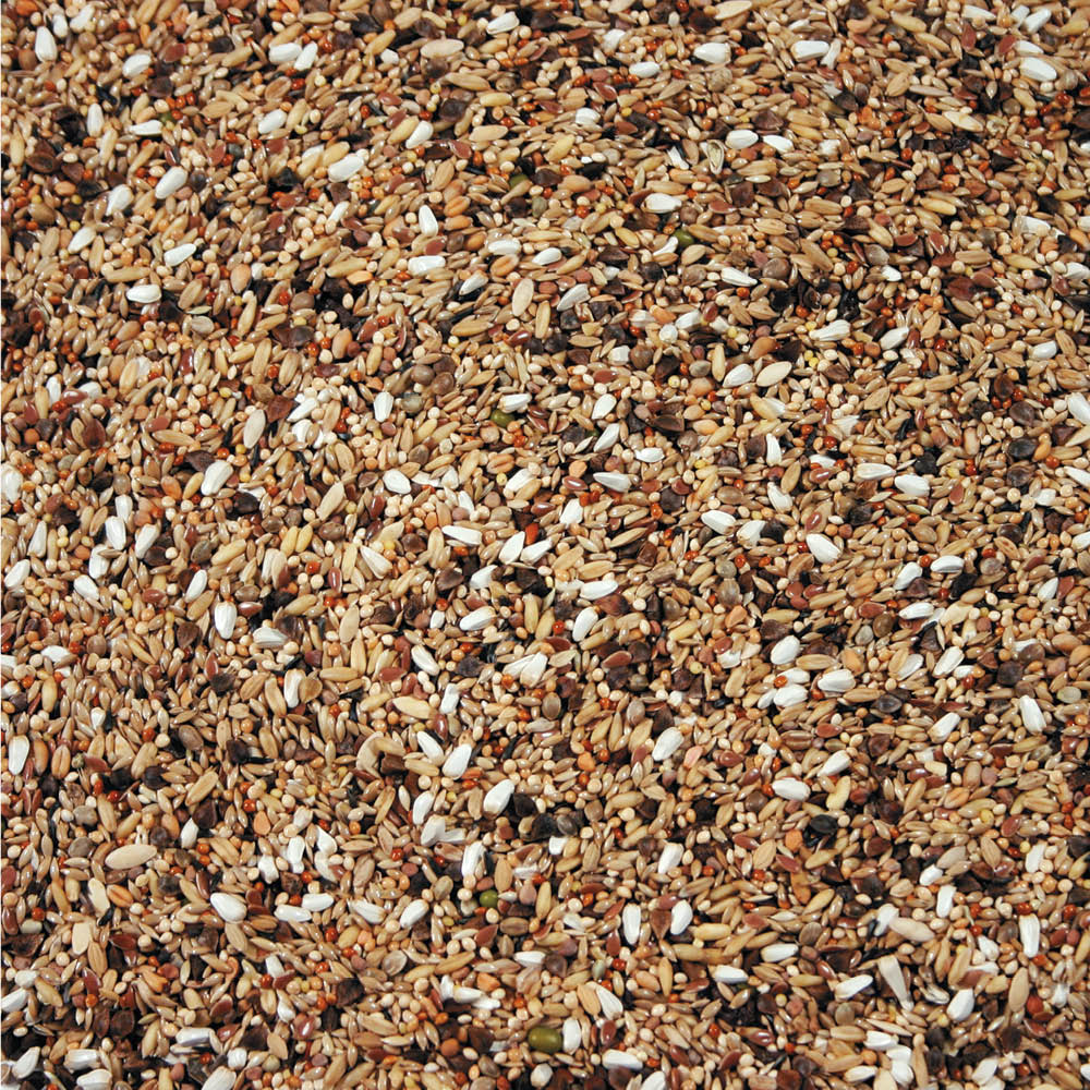 Composition Kanariafrø, afskallet havre, hvid hirse, boghvede, safflorfrø, hampfrø, hørfrø, gul hirse, rød hirse, hvede, paddy ris, nigerfrø, radisfrø, rønnebær, melonkerner, hybenkerner, mungbønner.