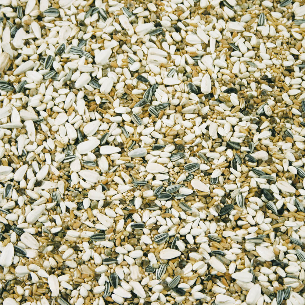 | Composition | Safflorfrø, kanariefrø, hampfrø, små solsikke, hvid solsikke, hvede, afskallet havre, hvid hirse, boghvede |