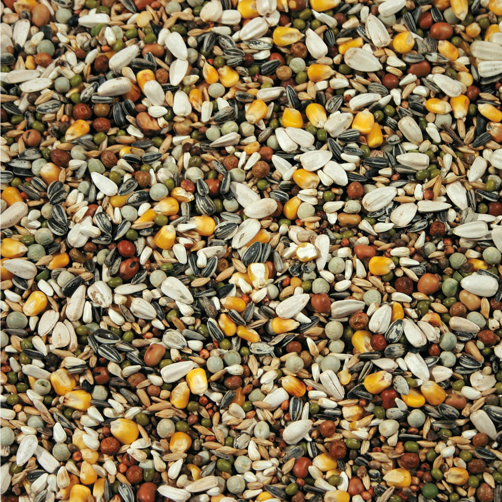 Composition Safflorfrø, majs, grønne ærter, gule ærter, mungbønner, små solsikke, byg, duebønner, vikker, gul hirse, hvid hirse, milo, havre, hampfrø, boghvede.