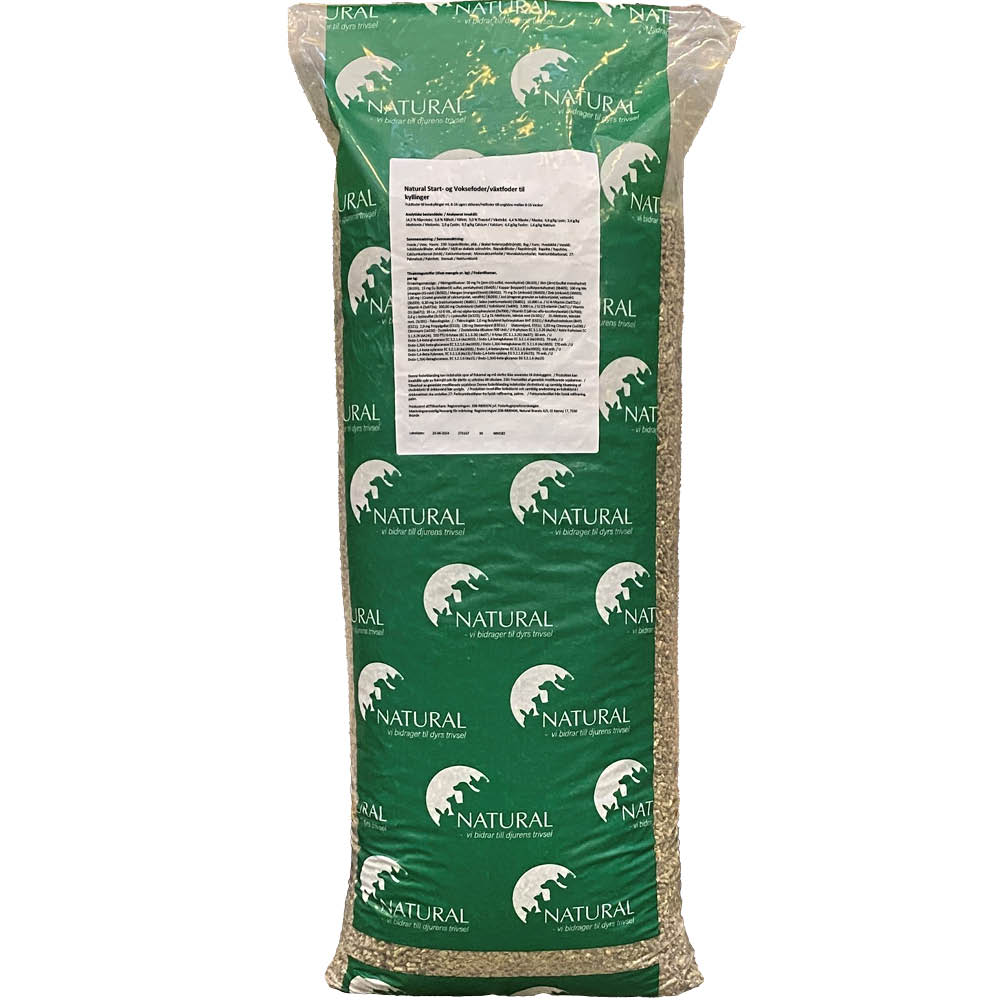 NATURAL Start- og Voksefoder til kyllinger indeholder de nødvendige vitaminer, mineraler og skaller, der sikrer stærke og sunde kyllinger.