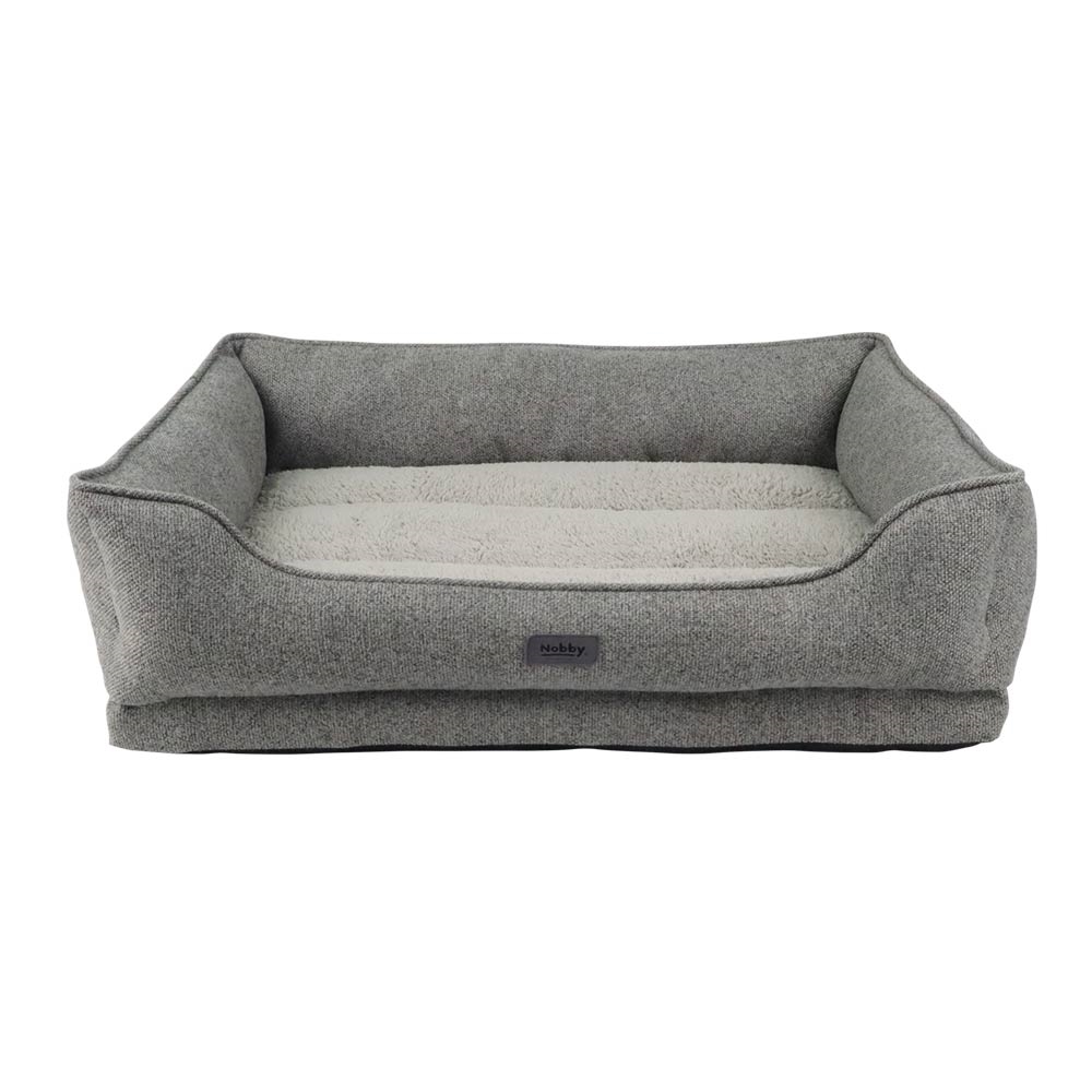 Orthopaedic Comfort seng i firkantet form “CALBU” i grå farve med stof i linned-look og blødt plys. Let på led og rygsøjle med en base af 3 cm hukommelsesskum og 4 cm komfortskum. Betrækket kan tages af med lynlås og har anti-slip knopper. Mikrofiberbetrækket har en base af 2 cm hukommelsesskum og 3 cm komfortskum. Puderne er fyldt med polyfiber. Sengen giver optimal liggekomfort ved at reducere trykpunkter. Den er særligt velegnet til ældre hunde med ledproblemer eller arthrose eller til forebyggelse af disse sygdomme.