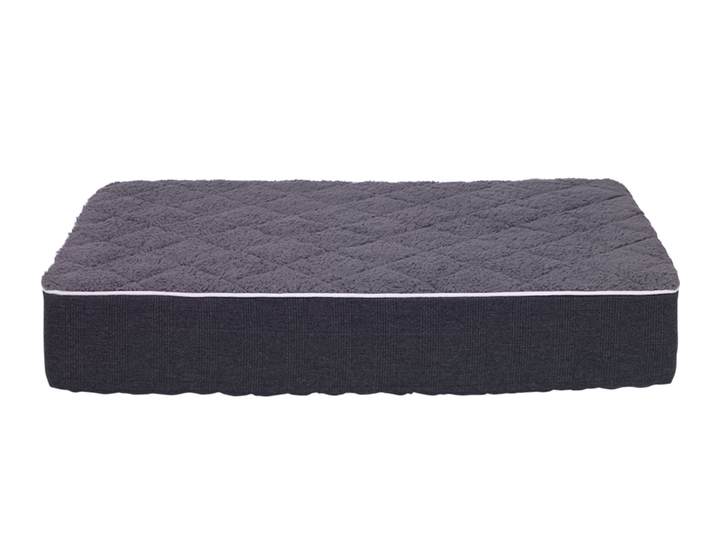 Mørkegrå; mikrofiber i linned look og blødt plys; bund: 4 cm memory-skum, 12 cm komfortskum; betræk aftageligt med lynlås; skridsikker; kun håndvask ved 30°C