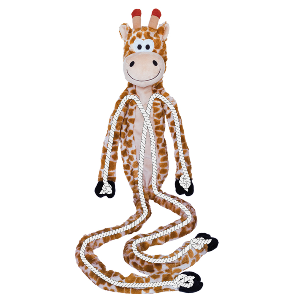 Plys giraf med reb, blød plys med indbygget pivelyd og knitrelyd i kroppen. Med kontinuerligt reb indeni. Giraffen er 113 cm lang.