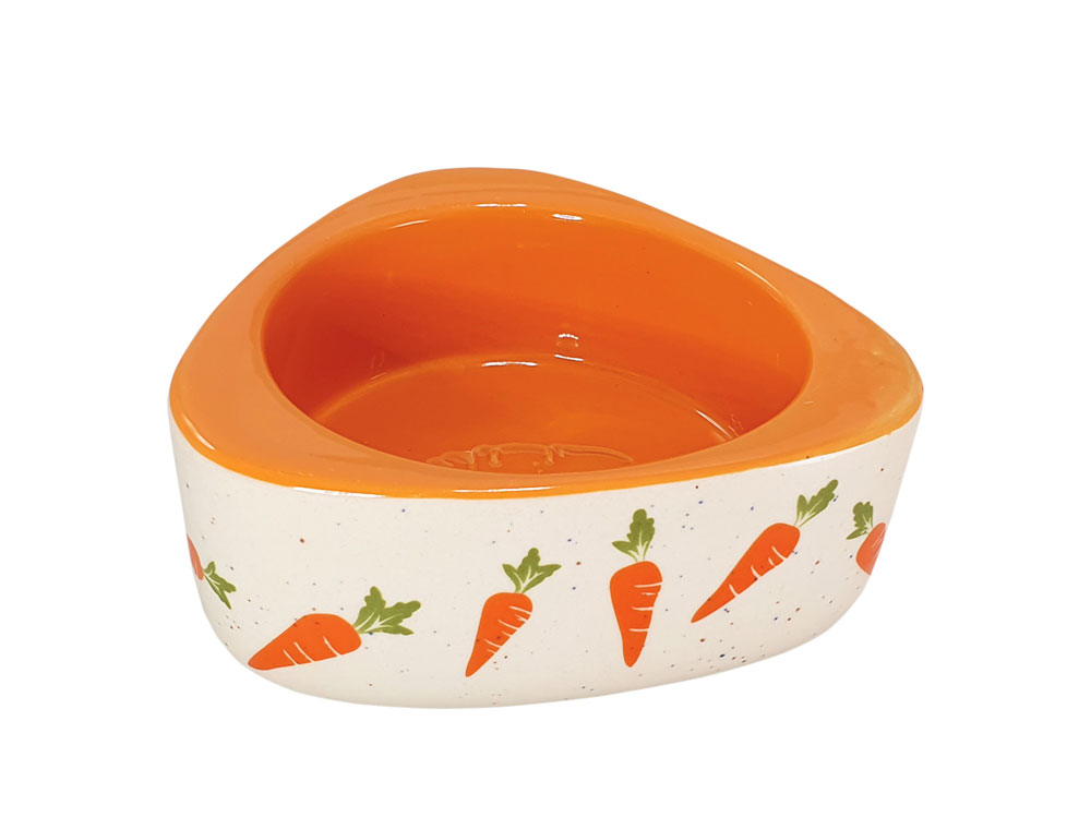Dekorativ keramisk skål til gnavere i Ø 19 x 3,5 cm og 0,35 l. Med print af gulerødder på ydersiden og gulerodsmotiv på indersiden.
