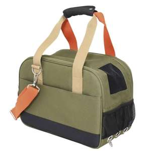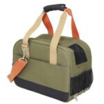 Slidstærkt mikrofiber, vaskbart; til katte og små hunde op til 6 kg; polstret, formbevarende taske; god ventilation gennem tre forskellige åbninger; med 3 utensilrum; stort utensilrum kan åbnes i bunden og fastgøres til selen