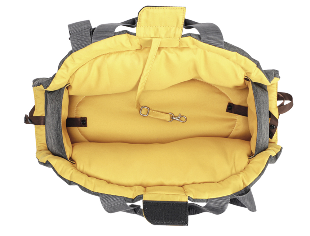 [0] => Slidstærk mikrofiber, vaskbar; til op til ca. 6 kg; brugbar som taske, pude og seng; med karabinhage