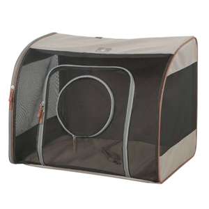 Transporttaske til bilen “ANGLESEY” i grå farve, lavet af slidstærkt mikrofiber, som er nemt at rengøre. Kan bruges som taske, katte- eller hundehus og har en speciel rem til fastgørelse på forsædet eller bagsædet. God luftcirkulation sikres af netindsatser på tre sider, og der er ekstra store åbninger og en mindre netindsats foran til at stikke hovedet ud. Indvendigt er der en karabinhage til at fastgøre hunden og en aftagelig bund. Der er også en rem til fastgørelse på nakkestøtten. Måler 60 x 40 x 45 cm.